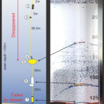 Navegamos con confianza con un café en la mano y una sonrisa en nuestros rostros, iluminados por el sol de primavera excepcionalmente brillante. Nuestras sonrisas, sin embargo, se convirtieron rápidamente en ceño fruncido confundido (Fig. 2) al llegar al sitio de amarre ya que no se veía la boya de superficie por ningún lado (Fig. 3). Chuuuuta, la boya de superficie y el registrador de turbidez adjunto se han ido. Un inconveniente menor por decir lo menos. ¿También se ha ido el resto del amarre? Inmediatamente, nuestras cabezas se volvieron hacia la ecosonda de los barcos, que reveló tres objetos en la columna de agua a profundidades que parecían corresponder a los componentes principales del amarre: la boya principal, la trampa de sedimentos y el liberador acústico (Fig. 4).